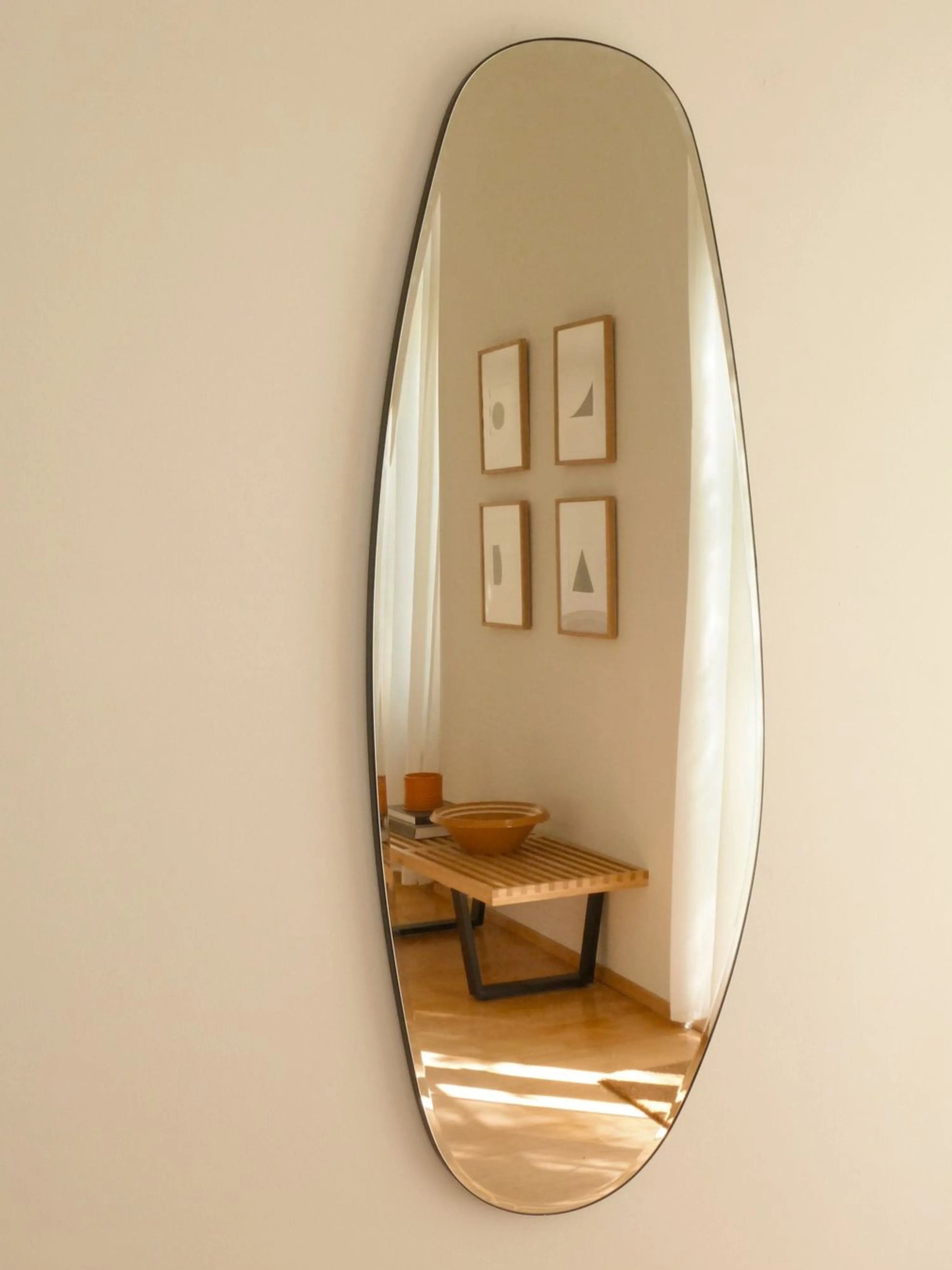 The unique opal-inspired design creates a calming and serene atmosphere, making it the perfect addition to any home decor. With its oblong shape, the mirror is a fit for any room, from the entrance to the bedroom. Measuring 150 x 55 cm, the Opal mirror makes a statement without overwhelming the space. A slim metal side-frame lends a sturdy, refined feel to the mirror without overwhelming, keeping a light and airy feel to the mirror. Can be mounted horizontally & vertically.